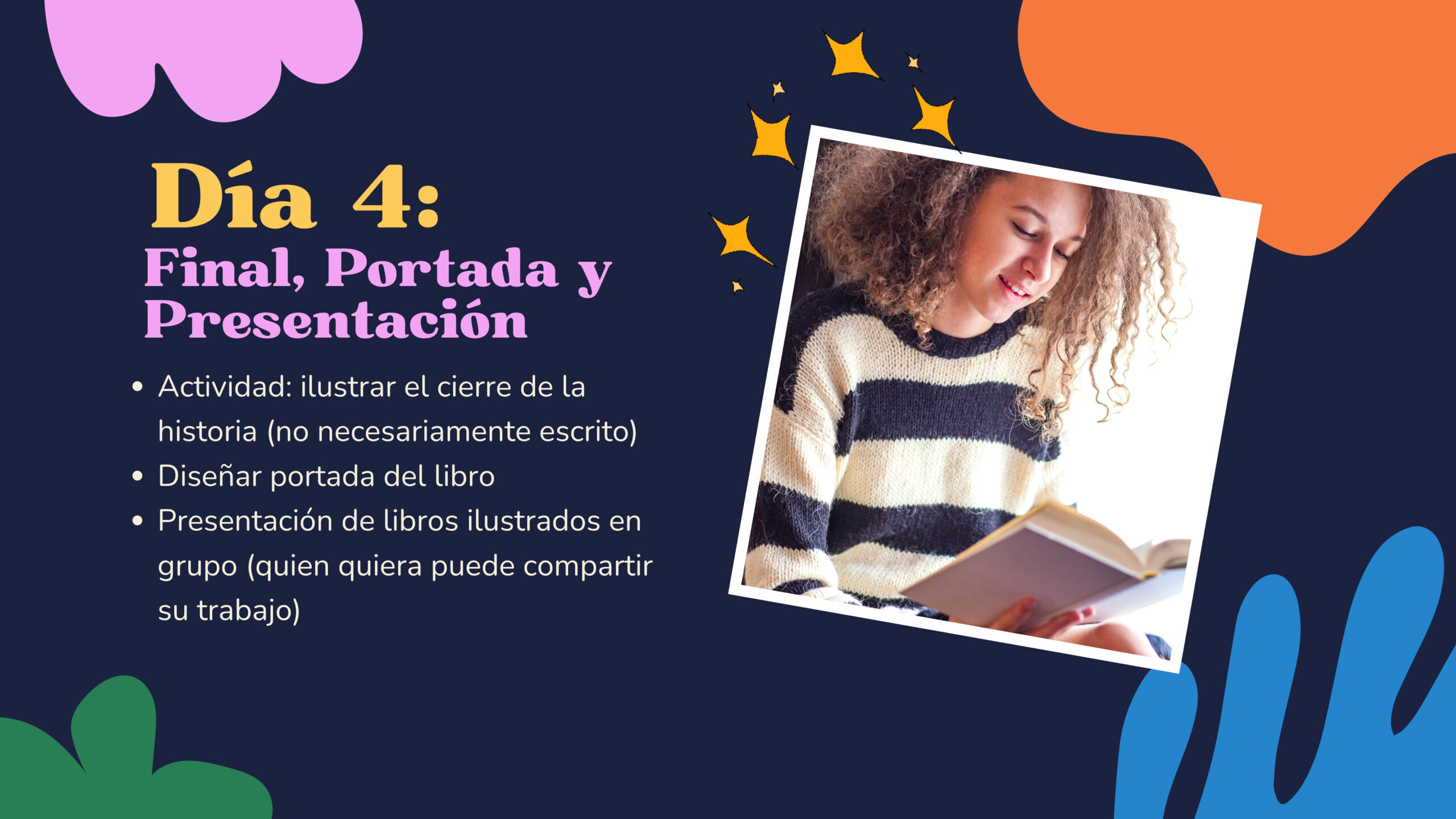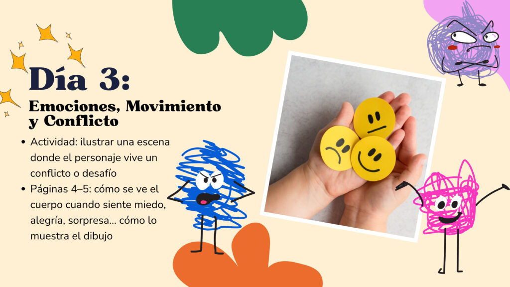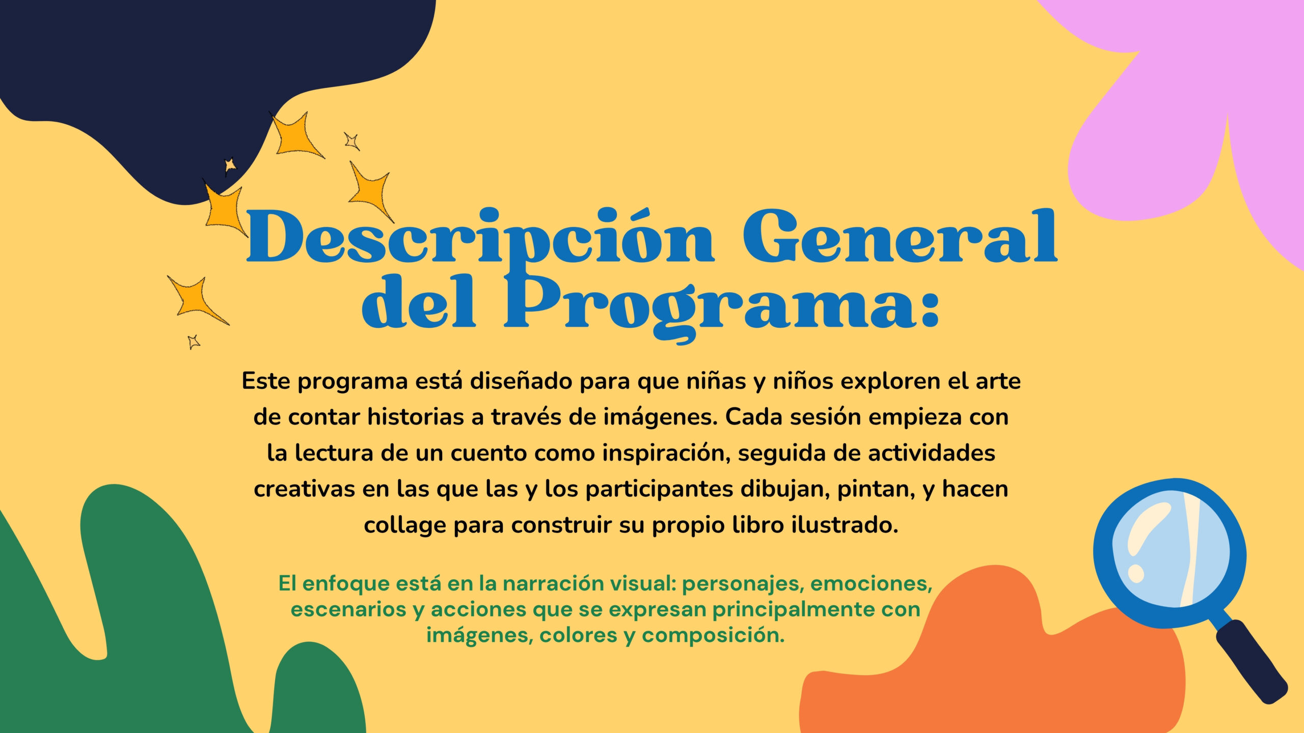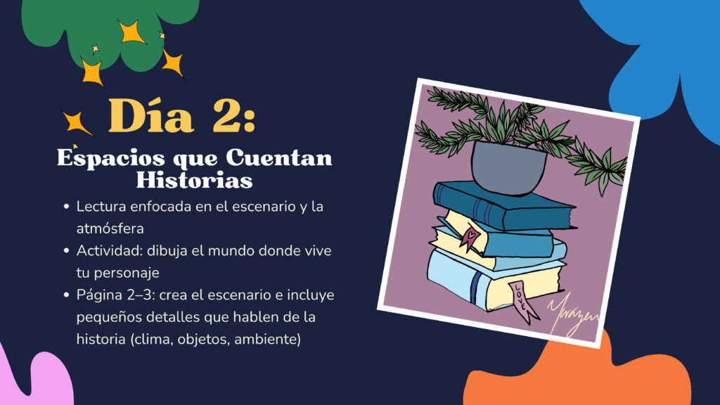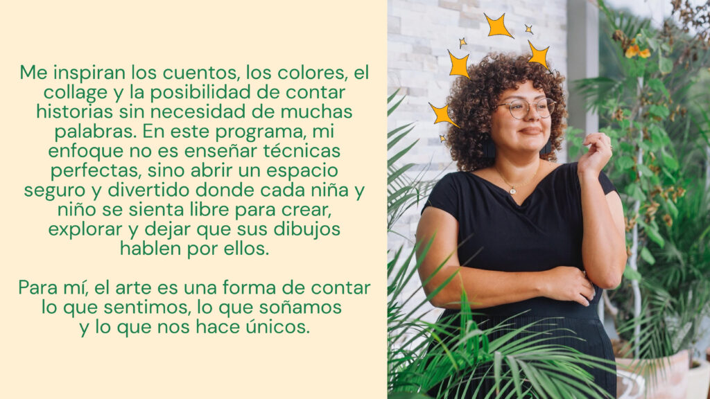 Los talleres de arte diarios, inspirados en las lecturas del día animarán a los niños a expresar sus ideas visualmente. Los proyectos incluirán: Libros de cuentos hechos a mano, Taller de cómics con el animador Héctor Alexis Rueda, Máscaras de personajes pintadas, Títeres de animales de la selva, Murales colaborativos y Dioramas y manualidades inspiradas en libros.