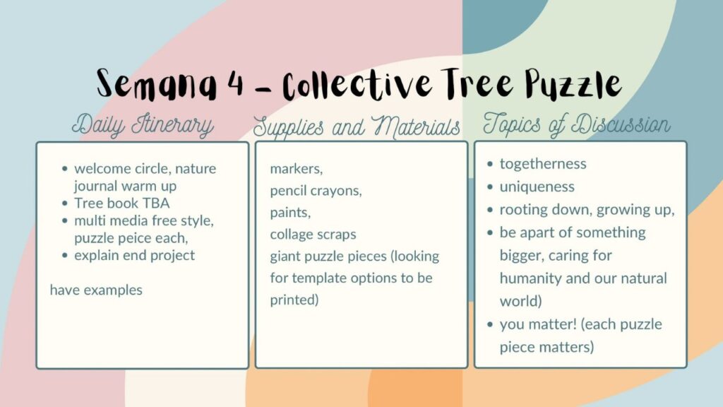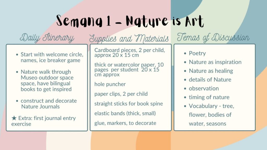 4 MUSEO – YURANI (story & illustration) | 5 | 6 MUSEO – COLBY Bilingual story Art workshop | 7 | 8 MUSEO – HECTOR/NATHALIE Comic Workshop, Clay work. 3pm Extra activity (theater, movie) | 9 | 10 |